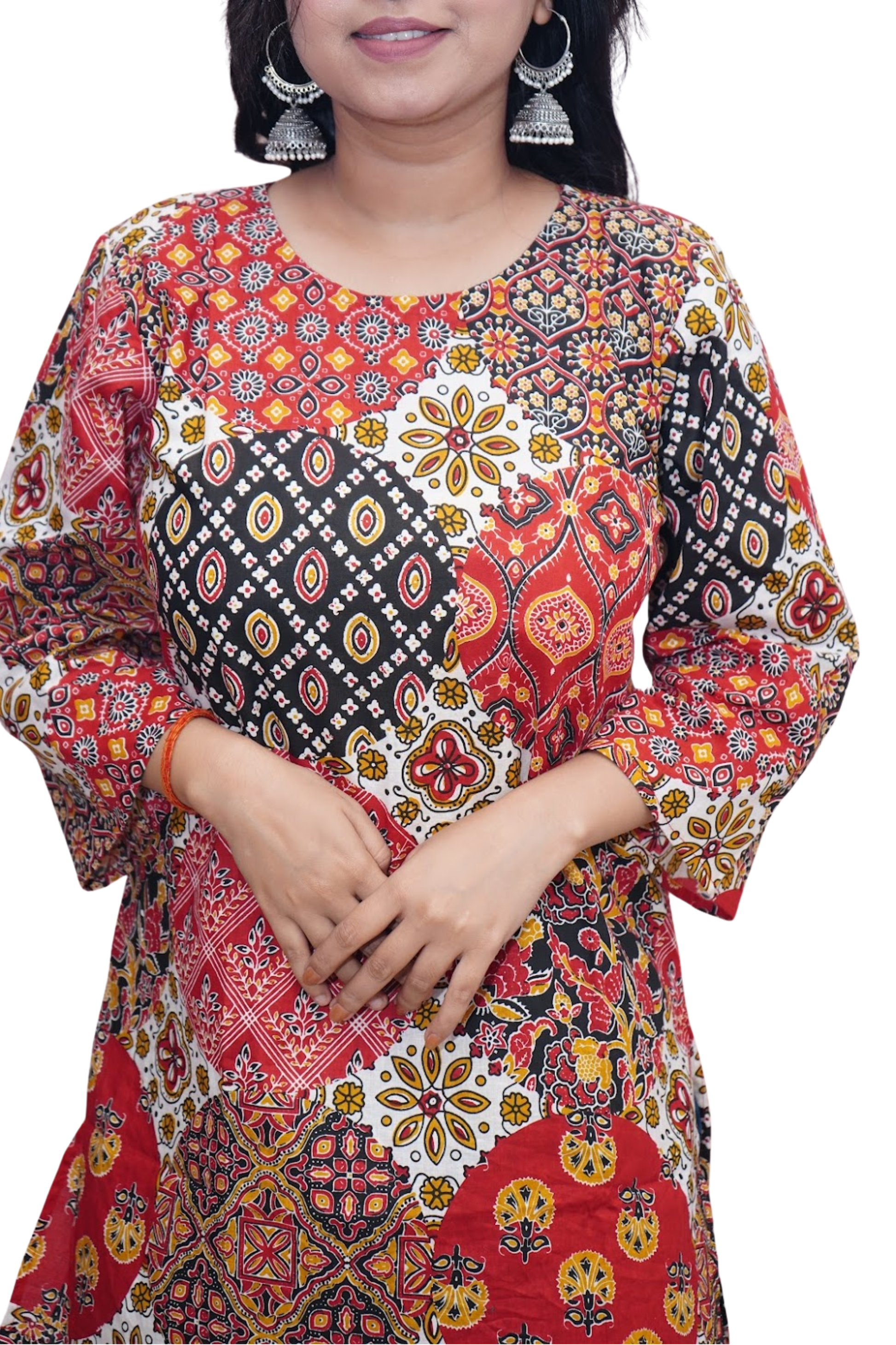 Add a vibrant touch to your wardrobe with this multicolor ajrakh patchwork cotton kurti from LABEL INSA. Featuring beautiful geometric and floral motives in reds, blacks, and yellows, this kurti is crafted from soft, breathable cotton. The unique patchwork design offers a modern twist to traditional prints, making it perfect for festive gatherings, work, or casual outings. Pair this statement piece with jeans, leggings, or ethnic bottoms for a bold, standout look.
