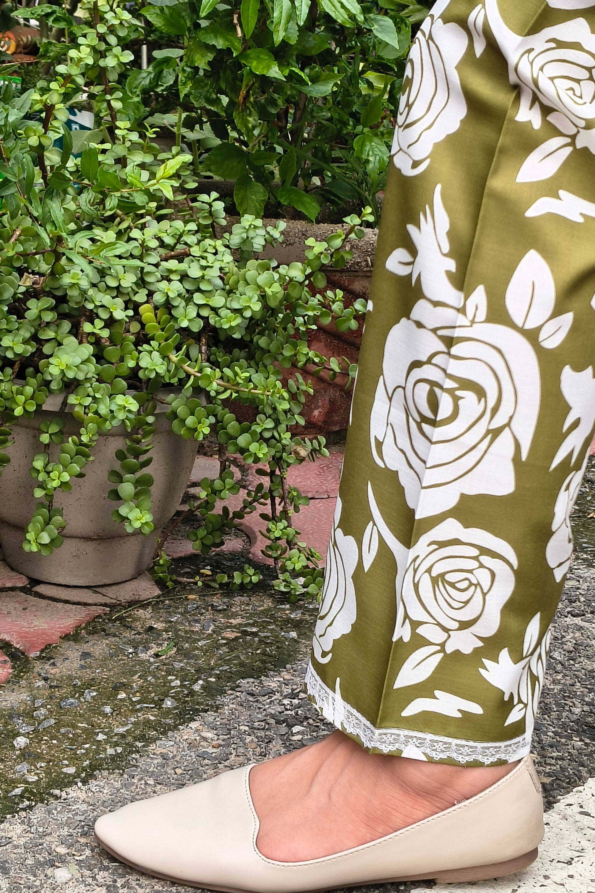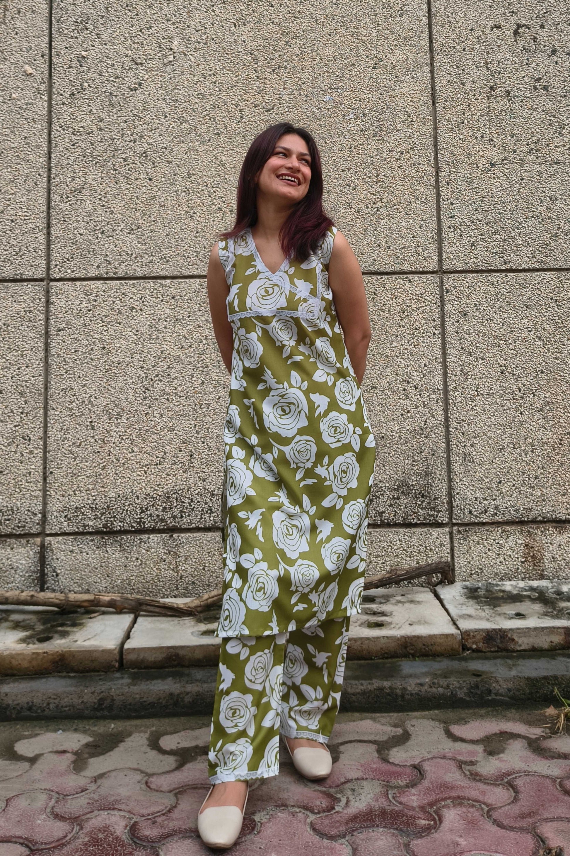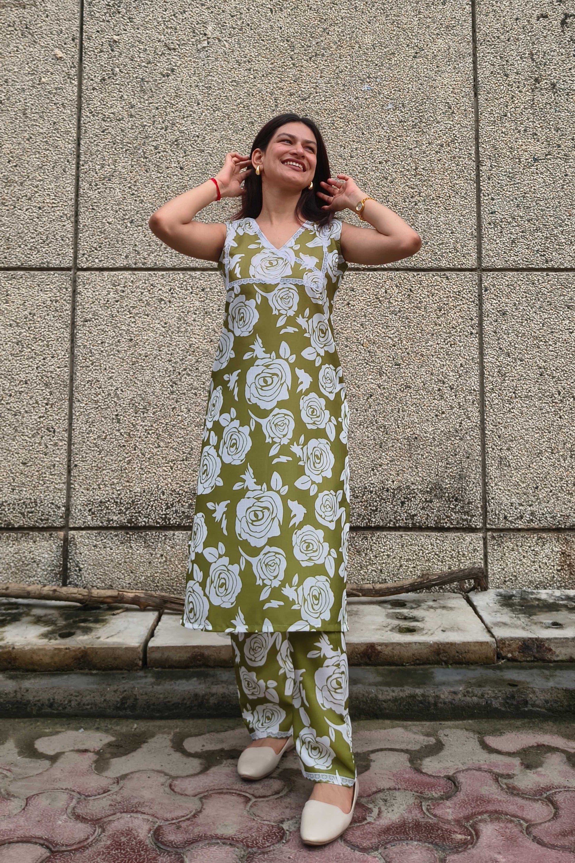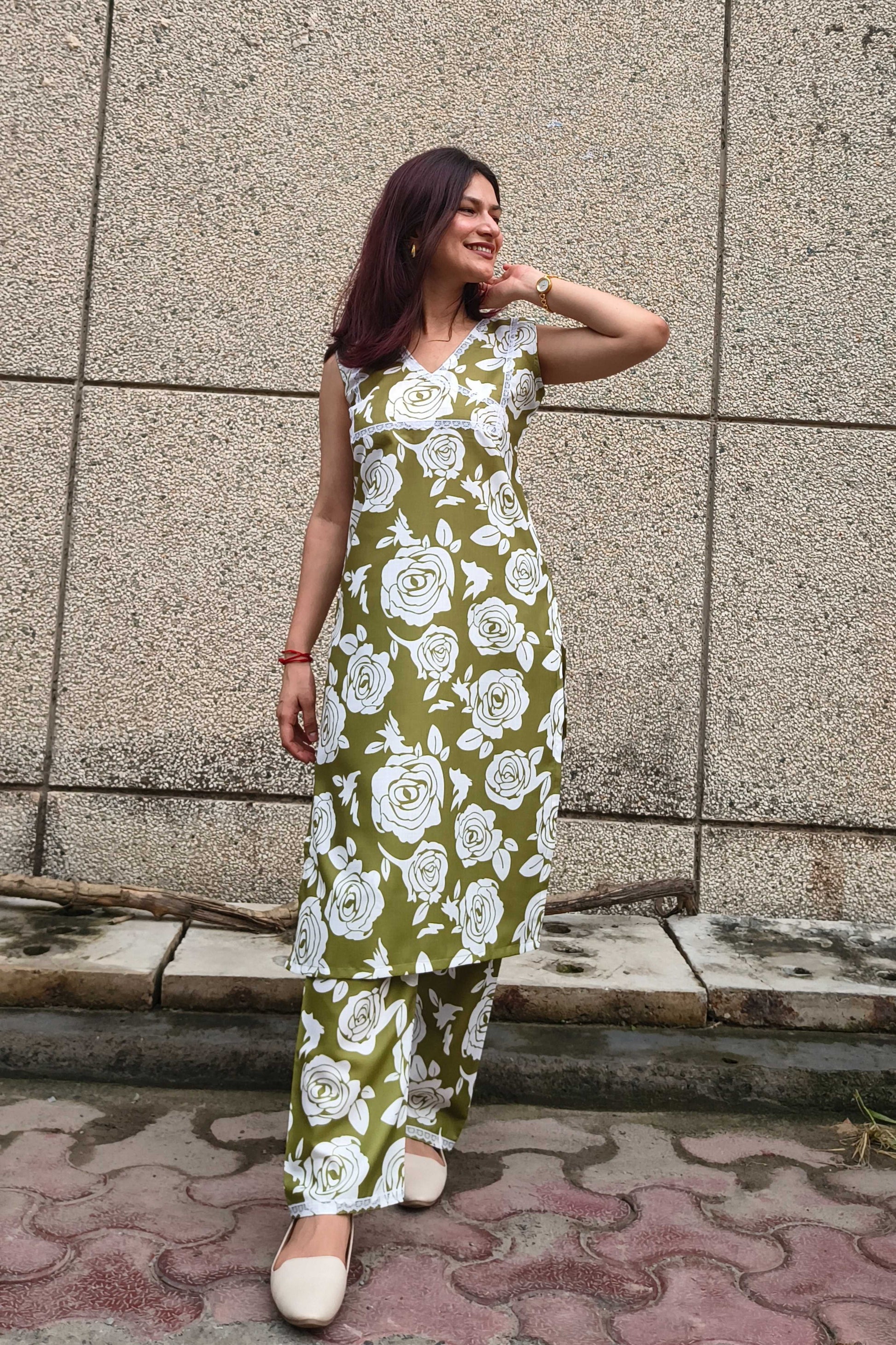 Step into effortless elegance with this olive green Kurta pant set featuring bold white floral prints. Crafted from breathable cotton fabric, the set includes a sleeveless kurta with delicate lace detailing on the neckline and hem, paired with matching straight-fit pants for all-day comfort. Perfect for casual outings, workdays, or festive get-togethers, this outfit blends style with ease, making it a versatile addition to your wardrobe. Pair it with minimal accessories and flats for a chic, relaxed look.